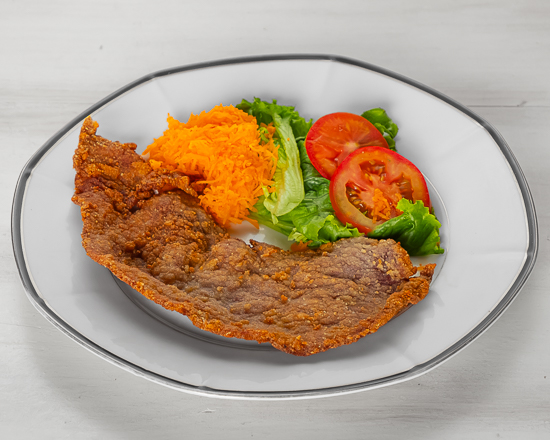 La única milanesa de 120 g de pollo o bisteck Keto crunchy, empanizada con harina de almendra y coco, con acompañamiento del dia, ensalada o guacamole